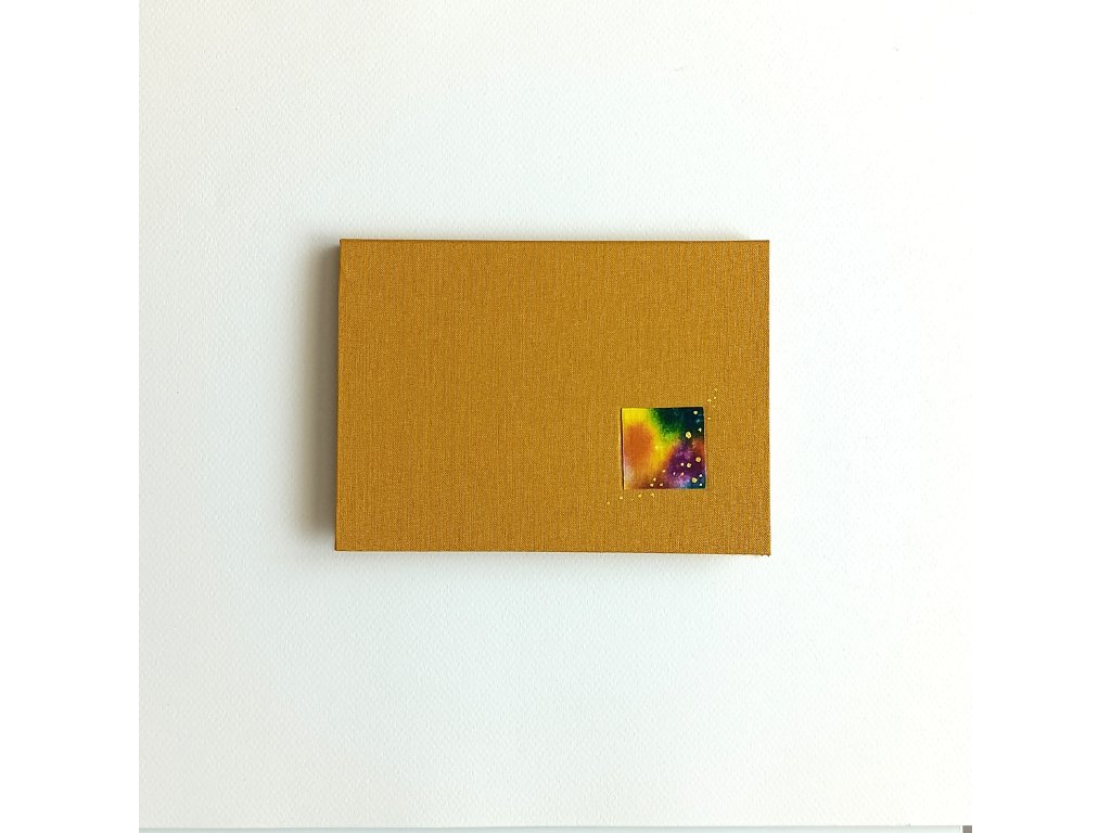 Obal potažený knihařským plátnem a doplněný originální malbou chrání vnitřní lepený blok papírů.