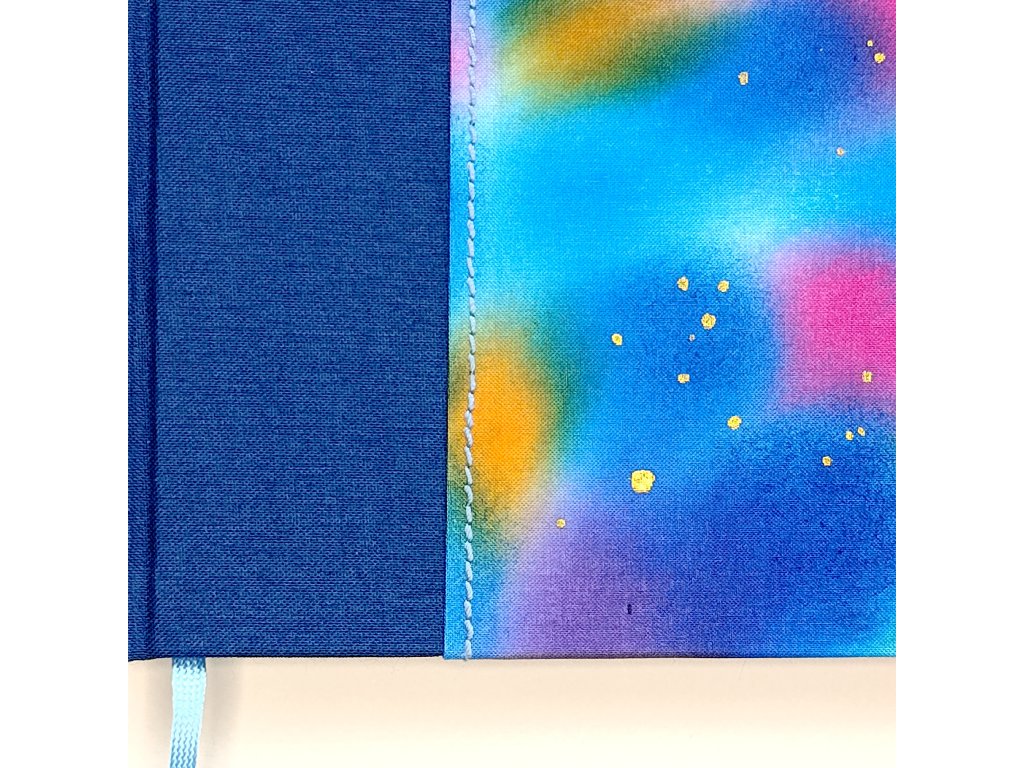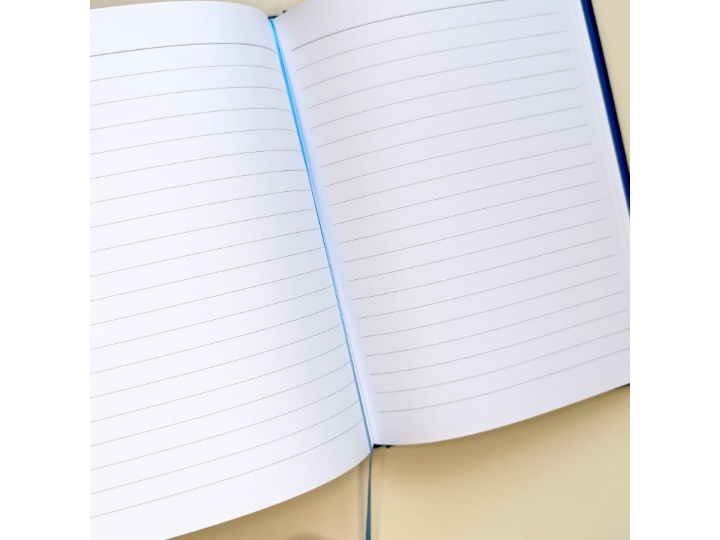 Linkovaný zápisník vyrobený šitou vazbou. Desky z pevné lepenky jsou potaženy knihařským plátnem. Vícebarevné plátno se může lišit, protože každý kus je originál. Ale každý modrý zápisník je v designu "Pod hladinou".
