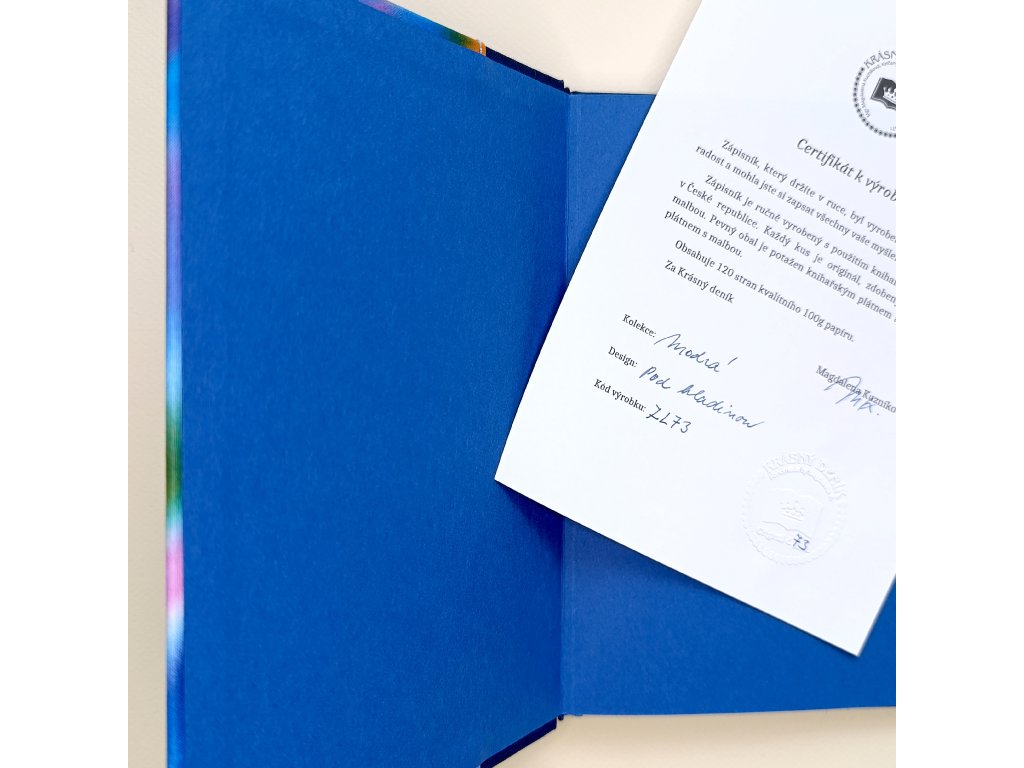 Nejedná o strojovou velkovýrobu. Každý kus jsem vytvořila s využitím technik poctivého knihařského řemesla. Připouštím možnou odchylku +-1%. V žádné fázi nebyla použita AI.