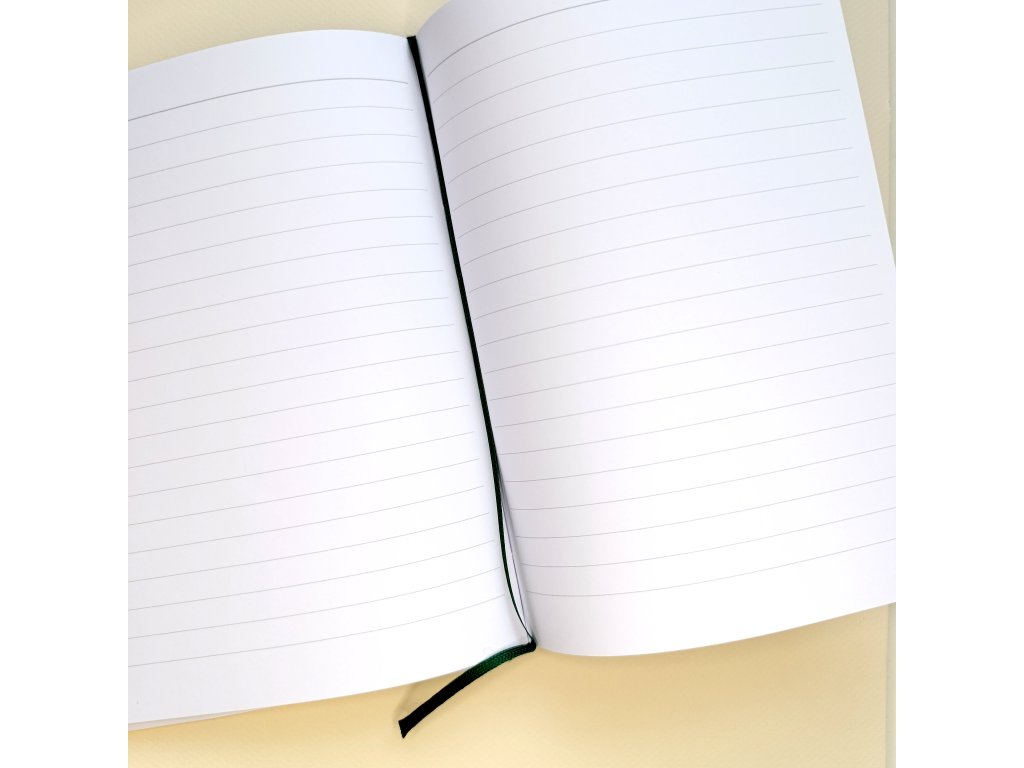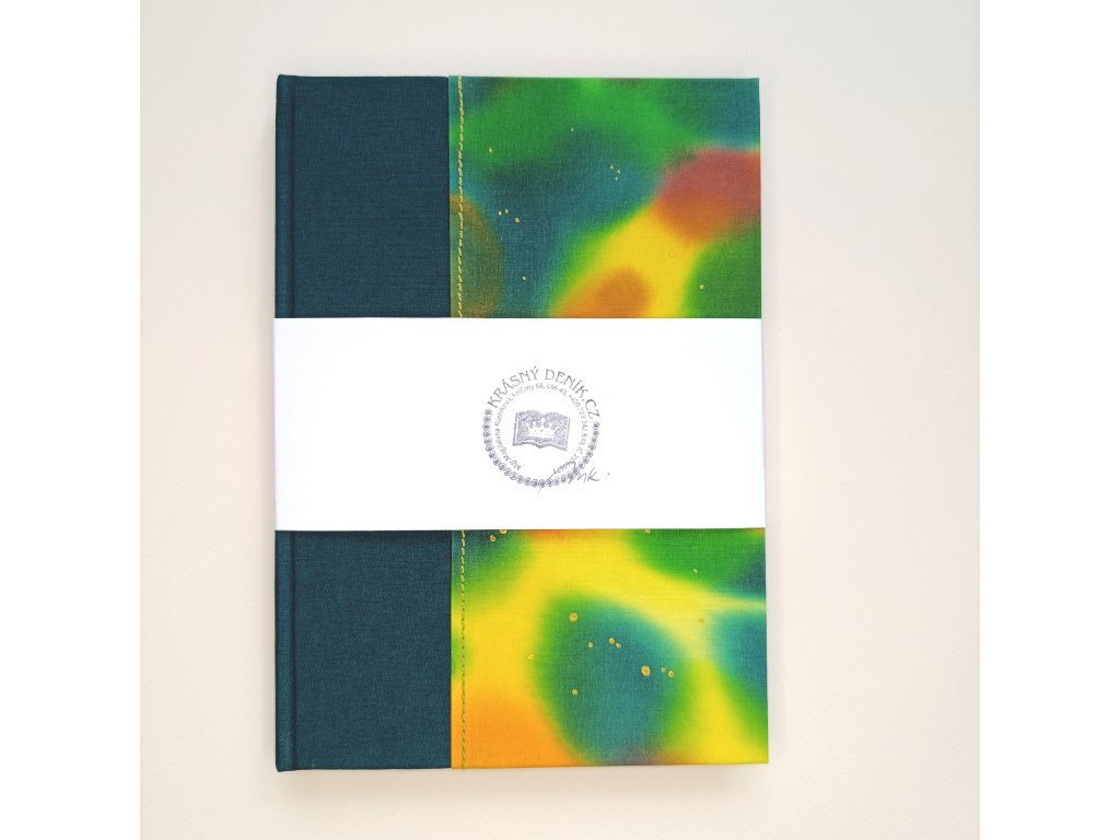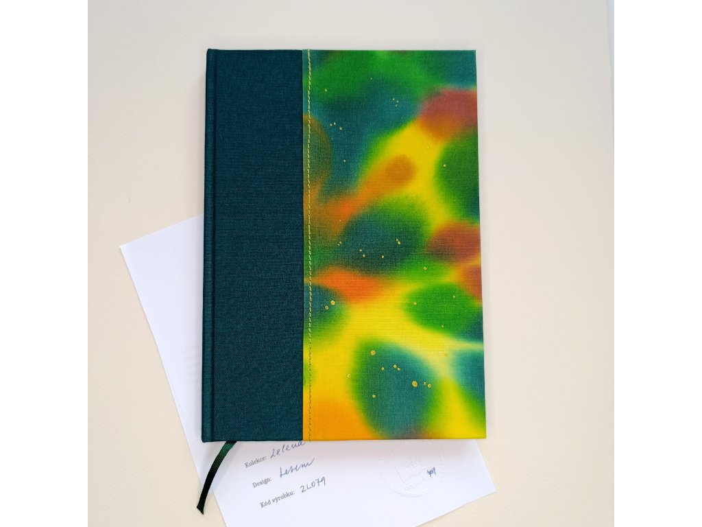Linkovaný zápisník vyrobený šitou vazbou. Desky z pevné lepenky jsou potaženy knihařským plátnem. Vícebarevné plátno se může lišit, protože každý kus je originál. Ale každý zelený zápisník je v designu "Lesem".